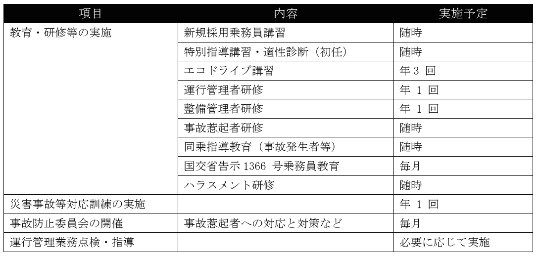 1. 年間教育訓練計画表を作成のうえ、輸送の安全に関する意識向上を図る。